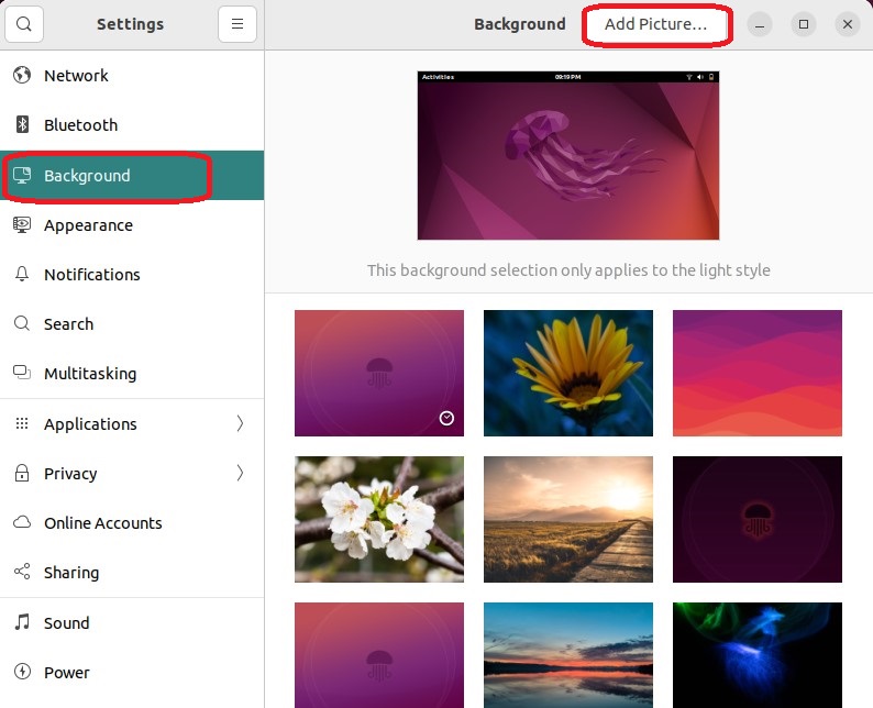 - Change the wallpaper. Click the App menu (the icon with 9 squares – similar to the Start menu on Windows), select Settings. Under Settings navigate to Background. Here you can select from any the pre-loaded images. You can also add your own photo by clicking the Add Picture… button from the title bar of the Settings window. Note: You can select different background for light style or dark style.
