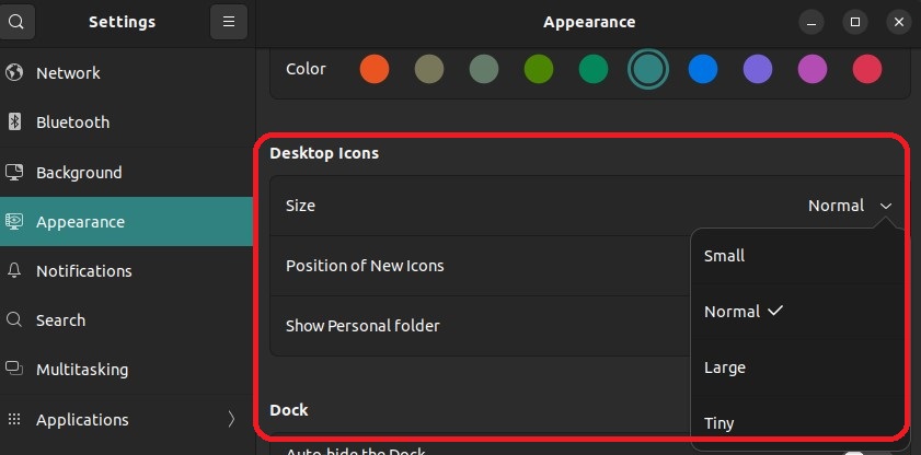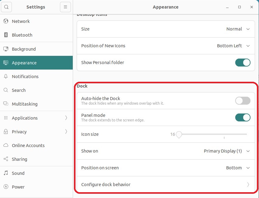 - Change the location of the Dock. Initially Ubuntu’s dock (similar to Windows taskbar) is situated vertically on the left side of the screen. To change it, In Settings => Appearance, scroll down to see Dock. Here, you can change the size of the icon, position on the screen (Left, Bottom or right), to auto-hide it when any windows overlap with it. If you’re using 2 monitors, you can also set which monitor it appears.