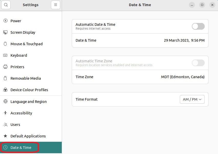 - Update Date & Time, time zone and time format. In the left panel of Settings, scroll down to Date and Time.